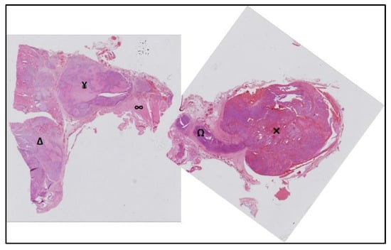 Post-operative pathology. Poorly differentiated follicular thyroid carcinoma (Δ) with extrathyroidal extension (¥) coming into contact with the muscle (∞) and invading the IJV via the middle vein thyroid (Ω), creating a tumor thrombus (×) at this level.