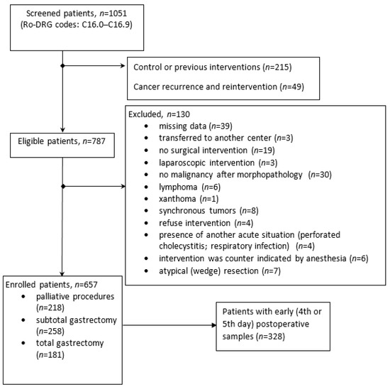 We conducted a retrospective cohort study on patients with gastric cancer from the surgery department at the “Prof. Dr. Octavian Fodor” Regional Institute of Gastroenterology and Hepatology, Cluj-Napoca, Romania, between 1 January 2016 and 31 December 2019.