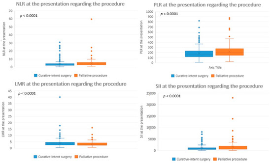 A statistically significant higher NLR, PLR and SII, and lower LMR were observed at presentation for the patient candidates who underwent palliative surgical procedures in comparison with those who underwent curative-intent resection (Table 2 and Figure 2).