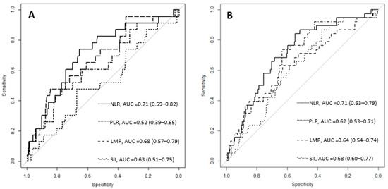 The ROC curves for inflammatory ratios considering death during the hospitalization period (A) and surgical complications (B). NLR = neutrophil-to-lymphocyte ratio; PLR = platelet-to-lymphocyte ratio; LMR = lymphocyte-to-monocyte ratio; SII = systemic immune-inflammation index; AUC = area under the curve, with 95% confidence intervals.