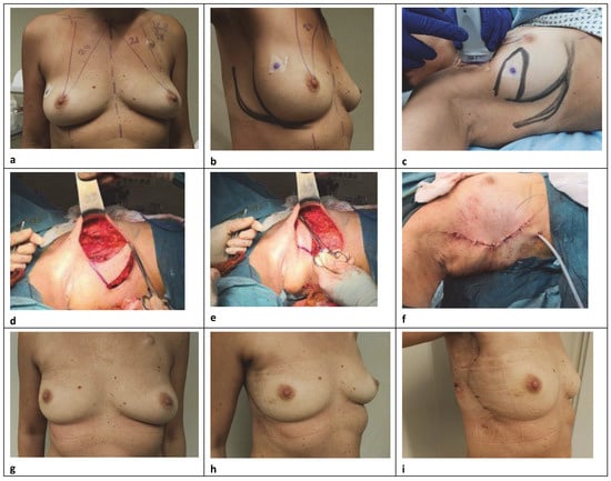 A 45-year-old woman with right invasive ductal carcinoma (yT0N0, Triple Negative G3). (a–c) Preoperative markings are shown. (c–e) Segment resection of the upper outer part on the right using the subaxillary replacement flap technique after neoadiuvant chemotherapy. (e,f) On table results after closing defect. (g–i) One month after surgery, frontal and side view.