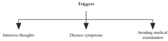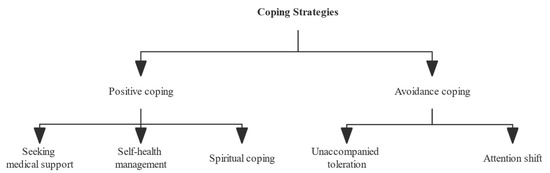 Separate thematic analyses were conducted on the triggering and coping strategies for FCR in cancer survivors. The study findings regarding FCR triggers reported the following three main themes: (1) intrusive thoughts; (2) disease symptoms; and (3) awaiting medical examination. When experiencing FCR, the coping strategies adopted by cancer survivors can be divided into two themes: positive coping and avoidance coping. Specifically, positive coping is composed of four sub-themes: (1) seeking medical support; (2) self-health management; and (3) spiritual coping. Avoidance coping, on the other hand, is composed of 2 sub-themes: (1) unaccompanied toleration; and (2) attention shifting. The above results are presented in Figure 1 and Figure 2.