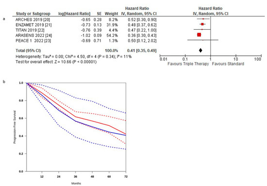 (a) Forest plot of progression-free survival hazard ratios obtained using a random model. Studies are arranged by publication year. (b) Curves of progression-free survival obtained using the approach of Combescure et al. with random effects. Blue lines represent the summarized disease progression curves and the 95% confidence bands (dashed lines) for control arm. Red lines represent the summarized disease progression curves and the 95% confidence bands (dashed lines) for triplet treatment.