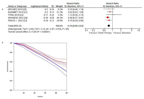 (a) Forest plot of overall survival hazard ratios obtained using a random model. Studies are arranged by publication year. (b) Curves of overall survival obtained using the approach of Combescure et al. with random effects. Blue lines represent the summarized disease progression curves and the 95% confidence bands (dashed lines) for control arm. Red lines represent the summarized disease progression curves and the 95% confidence bands (dashed lines) for triplet treatment.