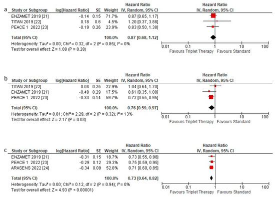 The impact on PFS and OS of treating mHSPC with triplet therapy was measured regarding the hazard ratio (HR). The HR of each study was either extracted directly from the publications or was estimated. Depending on the heterogeneity Χ2-test, the HR estimates were then combined into overall HR using either fixed or random effects models. The fixed-effects model was applied if heterogeneity was not detected (at the 10% significance level). Using the I2 coefficient, measuring the percentage of total variation across studies due to heterogeneity rather than chance [27], the heterogeneity of this meta-analysis was quantified. A triplet therapy regimen was deemed beneficial if the HR < 1. Statistical significance was considered if the 95% confidence interval (CI) did not overlap by 1.00 for overall HR.