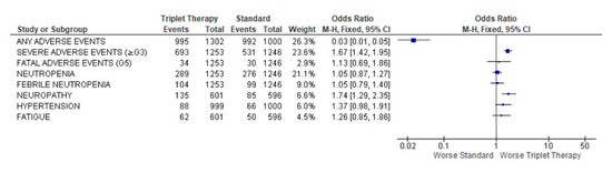 A severe adverse event (≥G3) was described in 1224 patients, 693 in the triplet treatment and 531 in the standard treatment, with OR 1.67 (95% CI 1.42–1.95), p < 0.0001. Neuropathy was more frequently recorded in the triplet treatment, 22.5% vs. 14.3%, with an OR of 1.74 (95% CI 1.29–2.35) p = 0.0003. No other toxicity rates were statistically significantly different (Figure 5) between the two groups, except, globally, adverse events were more frequent in the control group than in the experimental.
