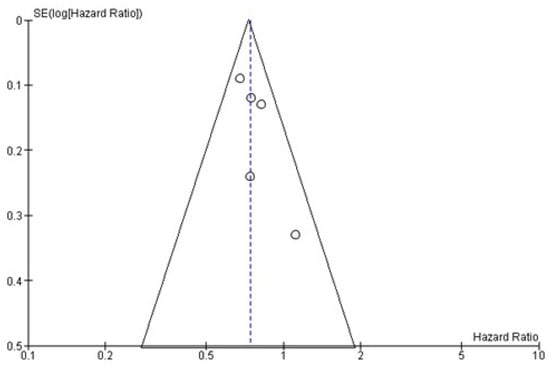 Funnel plot of OS. Symmetry in this graph indicates no publication bias. The circle represents the HR of each single study.