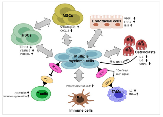 Hematopoietic stem cells (HSCs) reside in the bone marrow and they give rise to all the blood cell types of the myeloid and lymphoid lineages [17]. In adults, HSCs and hematopoietic stem and progenitor cells (HSPCs) reside in the bone marrow, acting according to their maturation states and activity [18,19]. HSCs are believed to exist close to the arterioles and any stress generally leads to HSC proliferation and distribution at distant locations in the body [20,21,22]. HSCs and HSPCs of MM patients differentiate into cells with endothelial cell characteristics, whereby they tend to express less CD133 and develop VEGFR-2, vascular endothelial (VE)-cadherin and factor VIII-related antigen (FVIII-RA) [23]. HSCs and progenitors have an immense effect on determining how the niche supports the growth of tumor. An important study mentions that genomic profiling of HSCs and progenitor cell subsets revealed aberrations of MM microenvironment signaling pathways, such as TGFβ signaling, cellular migration, cellular adhesion, etc. [24]. Furthermore, inhibition of the involving factors of HSCs and progenitor cells depends on MM-associated microenvironment conditions [24].