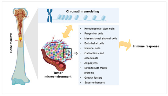 Multiple myeloma (MM) is a complex hematological malignancy that is characterized by clonal expansion of plasma cells within the bone marrow [1]. While the healthy plasma cells fight infections by producing antibodies, in multiple myeloma, cancerous plasma B cells accumulate in the bone marrow instead of the normal plasma cells and substitute the normal functioning of antibody production. MM is currently the second most common in the United States and constitutes about 13% of all hematological cancers [2]. In almost all MM patients, disease progression occurs by a specific sequence of events involving molecular modifications of plasma cells to its malignant form. This is followed by additional secondary mutation events, augmenting the disease progression. MM is a culmination of complex interplay between genetic aberration and cytogenetic alterations with the aberrations in the bone marrow environment, which results in modified immune system response and associated pathways [1], which essentially have an impactful role in chromatin remodeling. Chromatin remodeling is controlled by several chromatin remodeling complexes and some of these complex members, such as BCL7A and ARID family [3], have mutations in the noncoding and coding region of the myeloma genome. Recent studies have shown that ARID2, a component of the polybromo-associated BAF (PBAF) SWI/SNF complex, is a pomalidomide-induced neo substrate of CRL4CRBN [4]. In addition to BRD7, another crucial subunit of PBAF SWI/SNF complex is critical for pomalidomide-induced ARID2 degradation, indicating the therapeutic intervention of MM through SWI/SNF chromatin remodeling factors [4]. Additionally, the tumor microenvironment (TME) plays an immensely important role in promoting the expansion of specialized plasma cell types with the most aggressive traits. The bone marrow (BM) microenvironment contains various components, including the tumor-associated macrophages (TAMs), and has recently gained interest as a potential therapeutic target. In this review, we will provide updated and comprehensive insight into the current knowledge on the role of TME and its component immune cells, as well as its effect and crosstalk with chromatin remodeling factors and complexes.