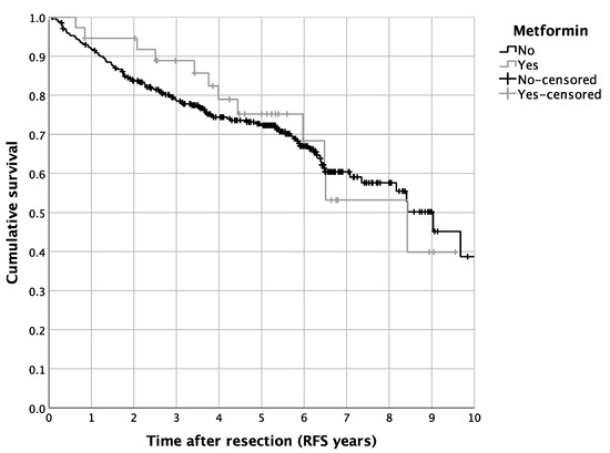 Survival of HNM patients differentiated by metformin use: Kaplan–Meier curves for RFS (p = 0.806, n = 382, patients with routine metformin medication: n = 39).