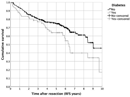 Survival of HNM patients differentiated by a diagnosis of diabetes: Kaplan–Meier curves for RFS (p = 0.018, n = 382, diabetic patients: n = 68).