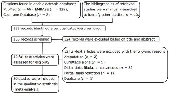 Only studies reporting on the postoperative function and complications after talar tumor resection followed by reconstruction were included. Patients who underwent resection alone for talar tumors without reconstruction or amputation were excluded. We also excluded cases for which the postoperative function and complications were not specified. Patients with talar tumors treated with curettage or partial resection were excluded. The data were extracted for the ankle joint range of motion (ROM) and American Orthopedic Foot and Ankle Society (AOFAS) ankle-hindfoot score, in which 40 points represents pain and 60 points represents ankle-hindfoot function and alignment, MSTS score [32], leg length difference, and complications. Only English and Japanese studies were included, and no restrictions were placed on the year of publication.