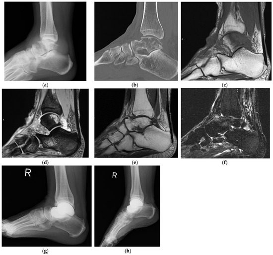 Primary diffuse large B-cell lymphoma of the talus (stage IA) in a 74-year-old woman. The patient presented with a chief complaint of ankle pain and swelling. (a) Radiography showed osteolytic lesions and talar body collapse. Soft tissue shadows were also seen anterior and posterior to the ankle joint. (b) Computed tomography showed diffuse osteolytic lesions and talar body collapse. (c,d) Magnetic resonance imaging (MRI) showed low-signal-intensity lesions on T1WI and high-signal-intensity lesions on T2WI in the posterior part of the talar body and the extraskeletal area (c: T1WI; d: T2WI). A needle biopsy was performed, and a diagnosis of diffuse large B-cell lymphoma was made. (e,f) After six courses of rituximab, cyclophosphamide, doxorubicin, vincristine, and prednisolone, MRI showed a marked reduction in tumor size (e: T1WI; f: T2WI); however, the patient had severe ankle joint pain due to the talar body collapse that was treated with talar tumor resection and total talar prosthesis reconstruction [36,47]. (g,h) Six years after surgery, osteosclerotic changes were observed in the distal tibia and calcaneus; however, the patient was able to walk unaided without pain. No tumor recurrence was observed (g: dorsiflexed position; h: plantar flexed position).