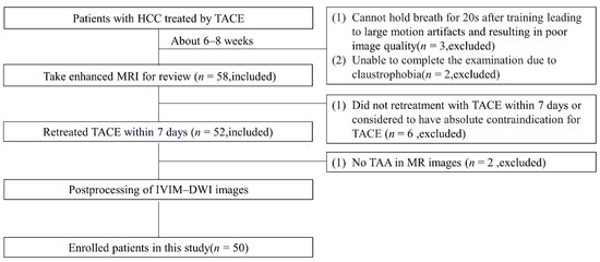 Fifty consecutive patients (9 women and 41 men) with HCC treated with TACE in the past 1–3 months were subsumed. The criteria for patient selection were as follows: (i) diagnosed with HCC [16], (ii) received TACE treatment in the past 1–3 months, and (iii) scheduled to undergo TACE retreatment within 1 week of the review. Of the 63 patients who were assumed to be eligible for this study, 13 patients were eliminated for the following reasons: (i) unable to hold their breath for 20 s after training, leading to large motion artifacts and poor image quality (n = 3); (ii) unable to complete the examination due to claustrophobia (n = 2); (iii) did not take TACE retreatment within 7 days after MR examination or had contraindication for TACE (n = 6); and (iv) no TAA was visible on the MR images or DSA images (n = 2). The flow diagram in Figure 1 indicates the process of enrollment for the study population.