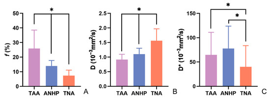 Mean values of various parameters of TAA, ANHP, and TNA. (A–C) The mean values of parameters f, D, and D* respectively. TAA: tumor active area; ANHP: adjacent normal hepatic parenchyma; TNA: tumor necrotic area. f: perfusion fraction; D: pure diffusion coefficient; D*: pseudo-diffusion coefficient. * represents that there is an obvious difference (p < 0.05).