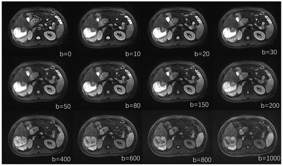 IVIM images at different b values. IVIM-DWI images with 12 b-values, representing b values of 0, 10, 20, 30, 50, 80, 150, 200, 400, 600, 800, and 1000 s/mm2.