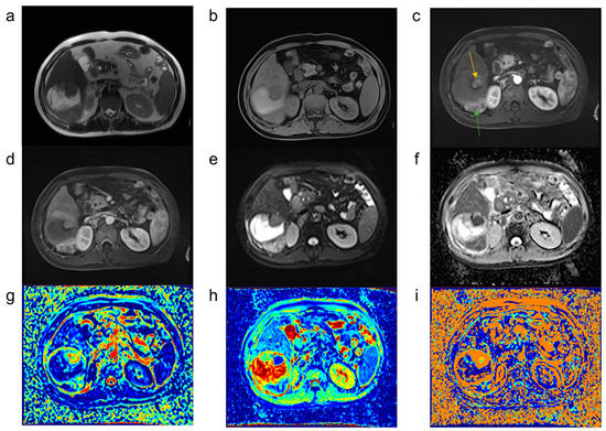 Magnetic resonance images of hepatocellular carcinoma treated using TACE. Most of the tumors after TACE treatment were necrotic, with the tumor active area (orange and green arrows) visible on the edge, which was significantly enhanced at the arterial phase, and the DWI image also showed a high signal intensity. (a) T2-weighted image; (b) T1-weighted image; (c,d) MR enhanced images; (e) diffusion-weighted image with a b value of 0 s/mm2; (f) ADC image; (g–i) parametric maps (f, D, and D*, respectively) calculated from the IVIM.