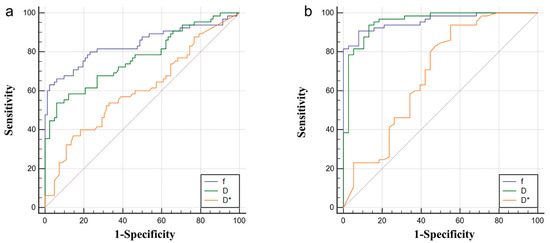 The f, D, and D* identify ROC curves of TAA from ANHP (a) and TAA from TNA (b). TAA: tumor active area; ANHP: adjacent normal hepatic parenchyma; TNA: tumor necrotic area.