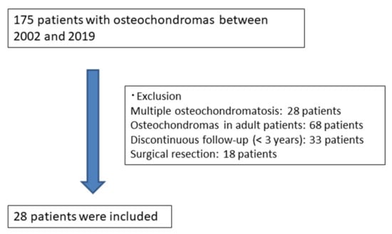- Durán-Serrano, M.; Gómez-Palacio, V.E.; Parada-Avendaño, I.; Gil-Albarova, J. Spontaneous regression of solitary osteochondroma in children: An option to consider in clinical practice. Jt. Dis. Relat. Surg. 2021, 31, 514–520. [Google Scholar] [CrossRef] [PubMed]