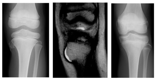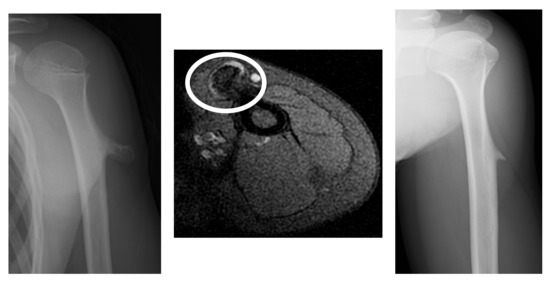 - Paling, M.R. The “disappearing” osteochondroma. Skelet. Radiol. 1983, 10, 40–42. [Google Scholar] [CrossRef] [PubMed]