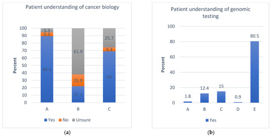 Patient survey responses regarding general knowledge of cancer and its testing. (a) A. Cancer represents uncontrolled cell growth; B. Genomics testing can be used to help predict how long a patient might live with cancer; C. Genomics testing can be used to help predict a patient’s response to a specific cancer drug. (b) Genomics testing (for acquired and inherited mutations) can potentially be used for which of the following: A. To confirm the type of cancer diagnosis, B. To predict the risk of cancer for an individual and their children or relatives, C. To select treatment and monitor a patient’s response to therapy, D. To predict disease outcome, E. All of the above.