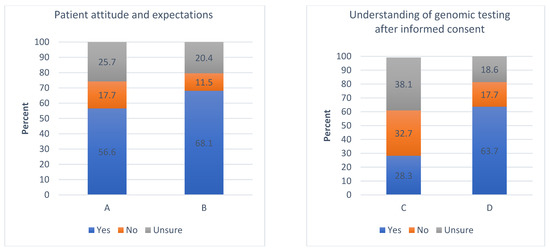 Patient responses to questions (in percentages) for attitude and expectations towards genomic testing and research. (A). I would only want to receive genomics test results that would influence my current or future cancer treatment decisions. (B). For example, I would want to receive genomics test results about my family’s inherited risk of developing cancer. (C). Do you think you have sufficient knowledge regarding the potential benefits and risks of genomics testing in cancer care to make an informed decision to pursue testing? (D). Would you need more formal counselling before pursuing genomic testing in your cancer care?
