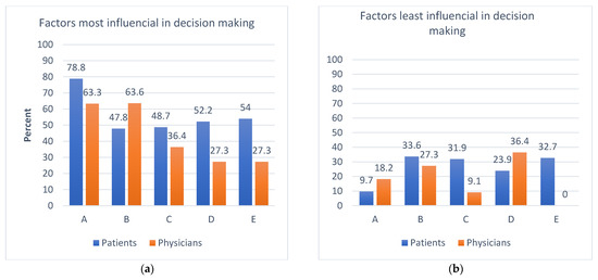 Concerning the factors that influence decision making, the potential to guide treatment influenced both the patients’ and physicians’ decisions the most (78.8%, n = 89 and 63.3%, n = 7, respectively). In addition, physicians were also found to be interested in the ability of genomic testing to predict the disease outcome (63.6%, n = 7). However, the views of patients were different from their oncologists with respect to the goals and expectations of genomic testing. Specifically, patients were more willing to know about their cancer and side effects from treatments and contribute to research, while physicians were more interested in patient outcomes (Figure 3a). Patients also seemed to be the least curious to know about the side effects and disease outcomes when making decisions about testing (Figure 3b).
