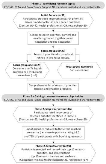 To be eligible to participate, individuals had to identify as part of one of three groups; those that work as health care professionals with adults with primary brain tumours, as researchers, or as consumers, which included patients, carers, and advocates. Participants from Phase 1 were invited to Phase 2, Step 1, and additional invitations were sent out via COGNO’s (n = 862) [21], BTAA’s, and Brain Tumour Support New Zealand’s mailing lists and social media. Participants who completed the Phase 2, Step 1 survey were eligible to participate in the Phase 2, Step 2 survey.