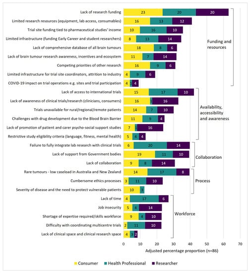 Figure 2 summarises the barriers to conducting brain tumour research from the highest to the lowest proportion of participants. The top ten barriers to conducting brain tumour research were in the categories of funding and resources (n = 5), availability, accessibility and awareness (n = 2), collaboration (n = 2), and process (n = 1). The top five barriers for the overall group were: lack of research funding; limited research resources; lack of access to international trials; failure to fully integrate lab research with clinical trials; and limited research opportunities for rare tumours with a low caseload in Australia and New Zealand.