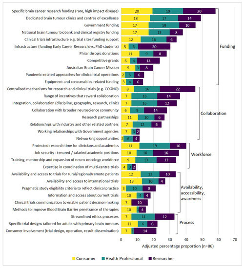 Although brain tumours are classified as rare cancers, there are currently a limited number of research grant opportunities available in neuro-oncology through the Brain Cancer Mission and Australian Medical Research Future Funding and other funding opportunities. Nevertheless, funding and resources for brain tumour research remain limited compared to that available for other tumour types [7,8]. Therefore, it is important to understand current research priorities for research focusing on adult brain tumours.