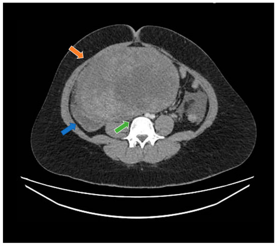 Computed tomography study in the portal phase showing a heterogeneous mass in the pelvic region (orange arrow), displacement of the intestinal loops to the right (blue arrow), and compression over the inferior vena cava (green arrow).