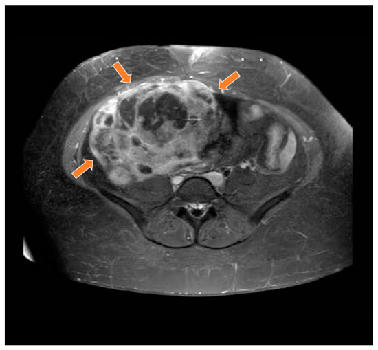 Magnetic resonance study in T1 weighted sequence post gadolinium showing a heterogeneous mass in the pelvic region (orange arrows).
