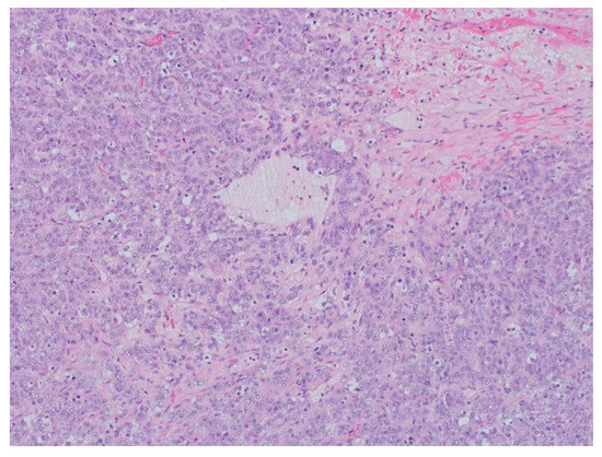 Macroscopically, SCCOHT presents as a large-volume tumor that is predominantly solid with hemorrhagic and cystic areas. Microscopy shows diffuse growth and areas of follicular architecture, outlining nests, and trabeculae. In 80% of these tumors, variably sized follicles appeared that were empty or contained eosinophilic fluid (less often basophilic), but were often very focal. The cells have round, monotonous, hyperchromatic nuclei with small nucleoli and scant cytoplasm. Other observations include spindle cell components, large cells with broad eosinophilic cytoplasm, foci of glandular differentiation, and mucinous cells. The mitotic activity is variable, and necrosis is frequent [9]. Because of the morphologic similarity to sex cord stromal tumors and germ cell tumors, the establishment of a correct diagnosis can be challenging [10]. There are some differential diagnoses, such as granulosa cell tumor, dysgerminoma, pulmonary ovarian cell carcinoma, lymphomas, or mesenchymal neoplasms with a small-blue-round-cell pattern.