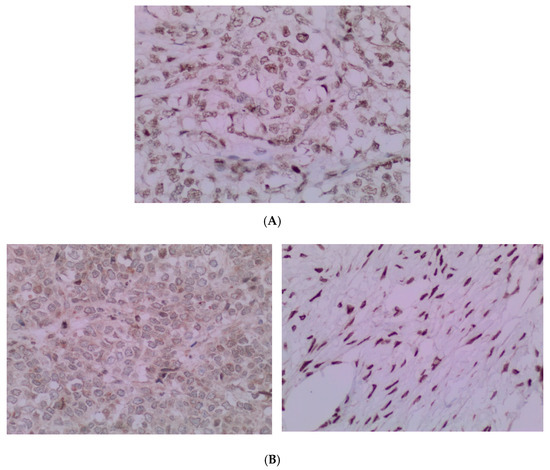 (A) The pathology analysis of the surgical specimen. The SMARCA4 expression is retained (IHC, 100×). (B) The pathology analysis of the surgical specimen. Lack of nuclear expression of SMARCA2 is noted (left) with the internal control of the SMARCA2 in the ovarian stroma (right). (IHC, 100×).