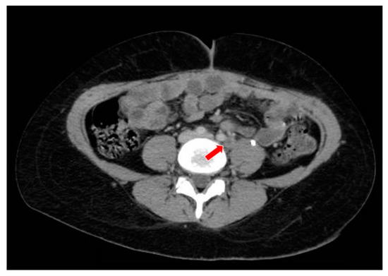 The computed tomography study in the portal phase showing a lymph node in the left iliac chain with a rounded aspect and a necrotic center (red arrow), suggestive of secondary neoplastic involvement (relapse).