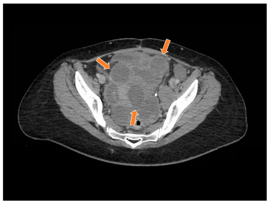 The computed tomography study in the portal phase showing a heterogeneous lesion in the pelvic region with cystic areas in between (orange arrows).