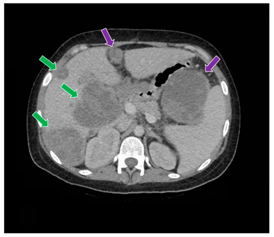 The computed tomography study in the portal phase demonstrates liver metastases (green arrows) and abdominal metastases (purple arrows).