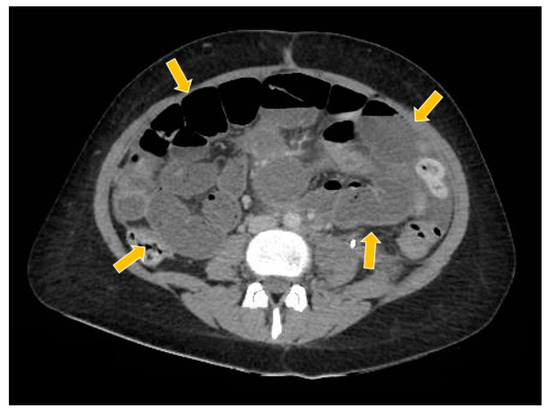 The computed tomography study in the portal phase showing the dilation of slender loops (yellow arrows) by distal extrinsic compression (new pelvic lesion).