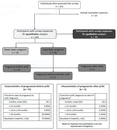 Prior research on yCRC and reproductive health is limited and has largely focused on clinical aspects during pregnancy and difficulties of diagnosing yCRC given that symptoms tend to be similar to those experienced in normal pregnancies (e.g., nausea, vomiting, constipation, and anemia) [,,]. Understanding of reproductive health impacts, particularly on family planning decisions, of yCRC among women who experienced pregnancy around the time of their yCRC diagnosis (e.g., before or after) as well as those who have never been pregnant are lacking. In general, cancer patients who are unaware of post-treatment fertility options experience more conflict regarding future family planning decisions []. There also tends to be discrepancies between what patients and healthcare providers find to be helpful when discussing reproductive health []. These discrepancies between patient and healthcare provider expectations around reproductive health can impact the care received []. As these prior studies have not been conducted among those with yCRC, it remains unclear whether women are having discussions about the reproductive health implications of yCRC with their healthcare providers. To address these gaps, our objectives were to: (1) characterize reproductive health outcomes of women after yCRC diagnosis according to pregnancy history (e.g., never been pregnant, have been pregnant); (2) determine how yCRC diagnosis influences family planning decisions; and (3) assess experiences with reproductive healthcare, including discussions with healthcare provider(s).