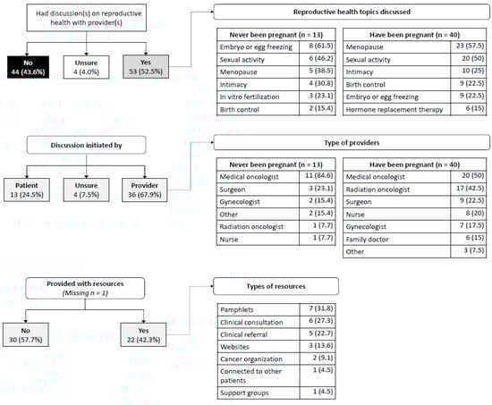 With respect to having discussions regarding reproductive health, 53 (52.5%) participants indicated having discussions with healthcare provider(s) after being diagnosed with yCRC, 44 (43.6%) did not, and 2 (4.0%) were unsure if these discussions occurred (Figure 2). Among those that had discussions, the majority (36, 67.9%) indicated that they were initiated by healthcare provider(s) and nearly a quarter (24.5%) of participants indicated they were initiated by themselves. The most frequently discussed topics among participants who had never been pregnant was embryo/egg freezing (61.5%) followed by sexual activity (46.2%) and menopause (38.5%). Among participants who had been pregnant, the most frequently discussed topics were menopause (57.5%), sexual activity (50%), and intimacy (25%). The healthcare providers that most frequently discussed reproductive health after diagnosis were medical oncologists (84.6% among participants who had never been pregnant; 50% among those who had been pregnant). Among participants who had discussions regarding reproductive health, 57.7% indicated that they were not provided with any additional resources (e.g., brochures or websites).