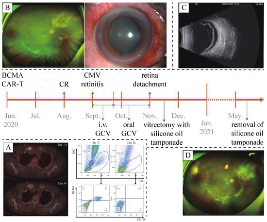 A timeline of the case. (A) Post-CAR-T flow cytometry of bone marrow sample and PET-CT confirmed the complete remission of multiple myeloma. (B) Anterior segment examination and fundoscopy at the diagnosis of CMV retinitis. (C) Ultrasonography of the right eye confirmed retinal detachment. (D) Fundoscopy after the removal of silicone oil tamponade, showing recovery from CMV retinitis and retinal detachment.