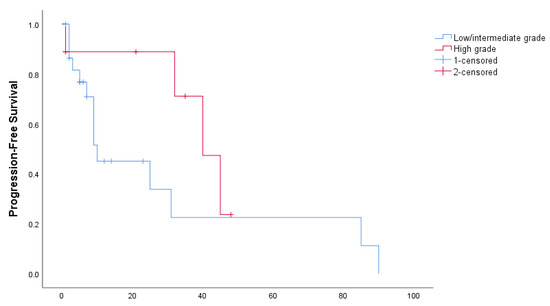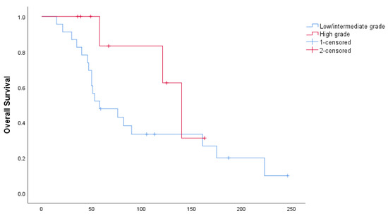 Median PFS in the entire cohort of patients was 31 months (95% CI: 0–66.8 months): 10 months in patients with low/intermediate-grade tumors and 40 in patients with high-grade tumors (p = 0.176), as shown in Figure 1. Median OS for the entire cohort was 82 months (95% CI: 32.8–131.2 months): 58 months for low/intermediate and 140 months for high-grade (p = 0.093), as shown in Figure 2.