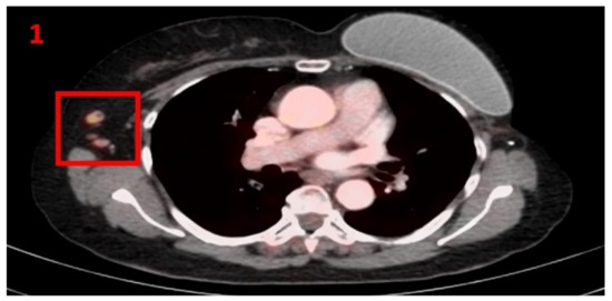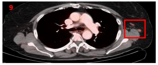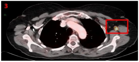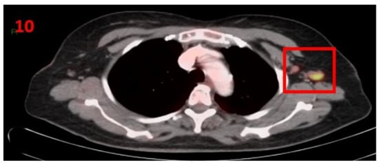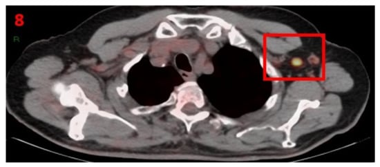 [18F]FDG PET-CT showing hypermetabolic uptake in the 10th patient with lymphadenopathy in the left axillary region (red square).