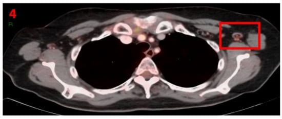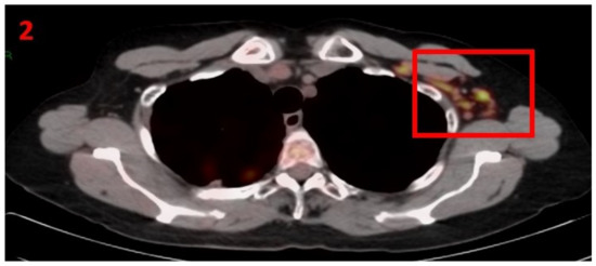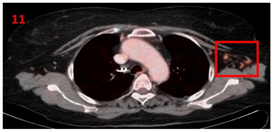 [18F]FDG PET-CT showing hypermetabolic uptake in the 11th patient with lymphadenopathy in the left axillary region (red square).
