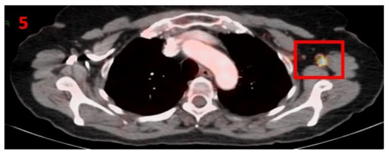[18F]FDG PET-CT figure showing hypermetabolic uptake in the 5th patient with lymphadenopathy in the left axillary region (red square).