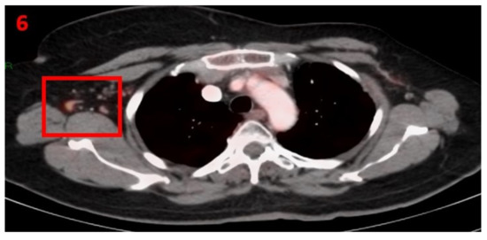 [18F]FDG PET-CT showing hypermetabolic uptake in the 6th patient with lymphadenopathy in the right axillary region (red square).