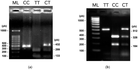 PCR-RFLPs results. Electrophoresis in 1.5% agarose gels of digested amplified products with Bpu10I and HpyCH4IV restriction enzymes (related to Figure S1) (a) Digested amplified products of SNP TOX3 rs3803662. (b) Digested amplified products of SNP MMP7 rs1943779. TT, CC, and CT genotypes are shown, and lane ML indicates the 100 to 1000 bp molecular gene ruler ladder.