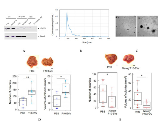 Comparison of the effects of pre-administration of F10-EVs and Nanog+F10-EVs in mice on the metastasis. (A) Western analysis of HSC70 protein in EVs and EV-depleted FBS. The lane of EV-depleted FBS is a sample of FBS after ultracentrifugation at 100,000 g × 80 min twice. (B) Particle size distribution of EVs determined by NanoSight analysis. Concentration: 3.07 × 1010 ± 0.06 particles/mL, Mode diameter: 90.0 ± 0.7 nm, mean diameter: 130.1 ± 1.0 nm, n = 5. (C) TEM photographs of EVs. Scale bars: (a) 500 nm, (b) 200 nm. (D) Effects of pre-administration of F10-EVs and PBS on the images, number, and volume of metastatic colonies after injection of F10 cells. Scale bar, 5 mm; n = 7. (E) Effects of pre-administration of Nanog+F10-EVs and PBS on the images, number, and volume of metastatic colonies after injection of Nanog+F10 cells. Scale bar, 5 mm; n = 14 for Nanog+F10-EVs, n = 7 for the control (PBS). The image of (A) was cropped from red dotted lines on full-length gel image shown in Supplementary Figure S4. **: p < 0.01, *: p < 0.05.