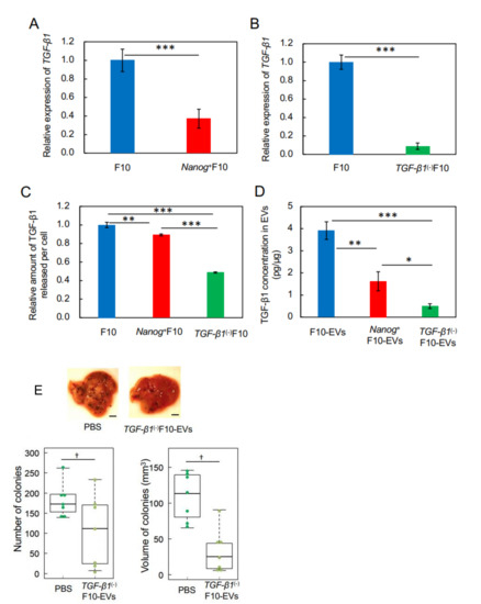 Effects of pre-administration of TGF-β1(-)F10-EVs on metastatic potential. (A,B) Decrease of TGF-β1 expression in Nanog+F10 cells and in TGF-β1(-)F10 cells, respectively, analyzed by quantitative RT-PCR and shown as the relative values to that in F10 cells. mean ± SD, for n = 3. (C) The amount of TGF-β1 protein released into the culture medium from Nanog+F10 cells and TGF-β1(-)F10 cells, respectively, analyzed by ELISA and shown as the value per cell that was counted immediately after collecting the culture medium. Results are shown as the relative values to that from F10 cells. mean ± SD, for n = 3. (D) TGF-β1 concentrations in EVs analyzed by ELISA. mean ± SD, for n = 3. (E) Effects on the images, number, and volume of metastatic colonies after injection of TGF-β1(-)F10 cells. Scale bar, 5 mm; n = 7. ***: p < 0.001, **: p < 0.01, *: p < 0.05, †: p < 0.1.