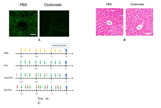 In order to deplete macrophages, clodronate-containing liposomes were injected into the tail vein of mice. Five days later, liver tissue sections were prepared and examined by immunostaining of a pan-macrophage marker CD68 to confirm the effect of clodronate. The specific images of macrophages detected in the control (treated with PBS) were lost by the treatment with clodronate (Figure 4A). Under the present condition of clodronate, however, no histochemical abnormality was observed (Figure 4B). Then, according to the schedule depicted in Figure 4C, clodronate-containing liposomes were injected together with Nanog+F10-EVs into the tail vein of mice for 3 weeks. The livers obtained under 4 conditions (PBS, EVs, Lipo-EVs, and Clo-EVs) were used for quantitative RT-PCR of the following macrophage markers: CD68 and F4/80 (pan-macrophage markers), CD80 and CD86 (M1-type macrophage markers), and CD163 and CD206 (M2-type macrophage markers). Of these markers, only CD163 showed a significant change between conditions of PBS and EVs (Figure 4D). The expression of CD163 was reduced to 0.62 of that of the control (PBS). CD163 expression was completely lost by clodronate-containing liposome (Clo-EVs), indicating that CD163 decrease was caused by the decrease of macrophages. Therefore, possible effect of CD163 change on the metastasis, if any, can be disabled by clodronate treatment.